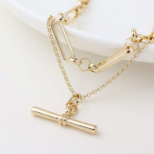 POM Double Layer Chain and T Bar Necklace Gold Plated