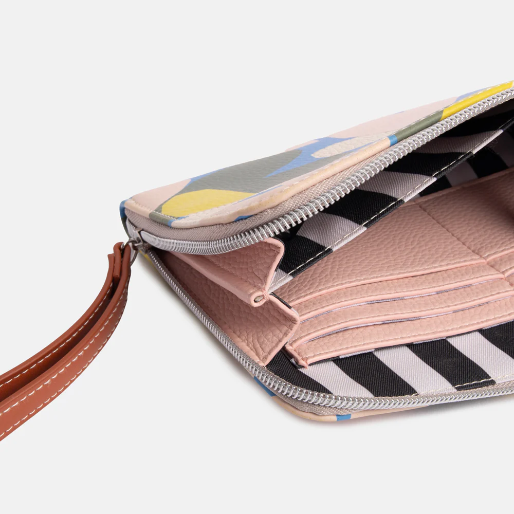 Our new travel wallet has been designed to organise cards, cash, passports and documents with a practical wristlet to carry safely when on-the-go. The pouch features our new colourful confetti hearts print with a contrast stripe lining.